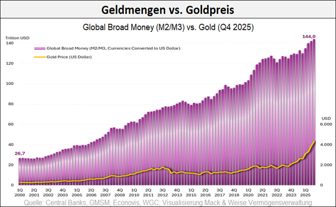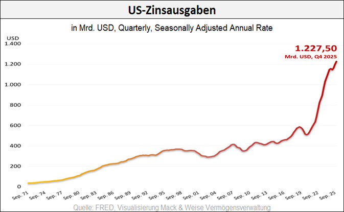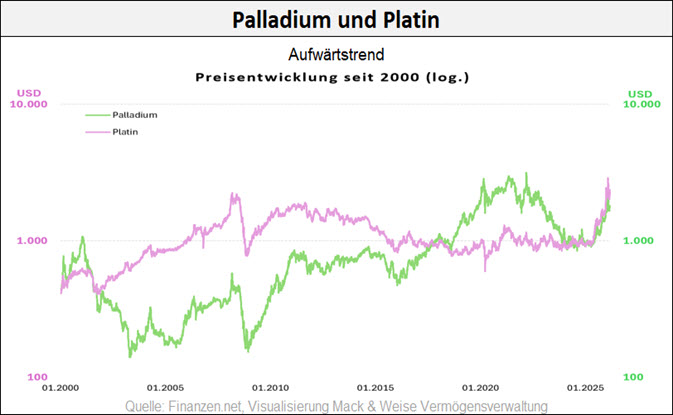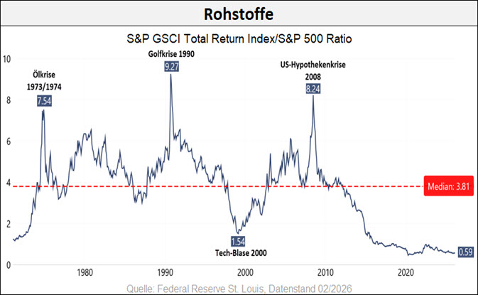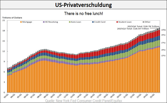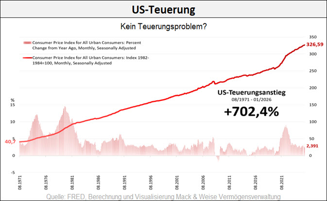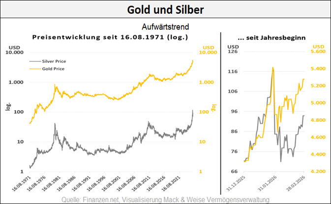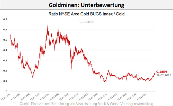 Im Februar erholten sich die Edelmetallmärkte wieder deutlich von den Ende Januar/Anfang Februar gesehenen Kurseinbrüchen und konnten trotz der heftigen Turbulenzen eine mehr als erfreuliche Performance verzeichnen. Seit Jahresbeginn stiegen Gold und Silber um deutliche 22,3 % bzw. 31,6 % an, während die Goldminenaktien, die insgesamt eine sehr positive Berichtsaison ablieferten, sogar um 39,5 % zulegen konnten. Dass es nach den Überhitzungen insbesondere bei Silber auch immer wieder zu heftigen Korrekturen im Aufwärtstrend kommt, ist Börsennormalität und markttechnisch auch nur gesund. Die für die Einbrüche nachgeschobene Begründung allerdings, dass der vehement eine lockere Geldpolitik einfordernde Präsident Trump nun mit Kevin Warsh tatsächlich einen als hawkish einzuschätzenden Fed-Präsidenten berufen haben soll, kann man allerdings nur in die Abteilung Unterhaltungswert verbuchen. Allein angesichts der ungebremst weiterwachsenden US-Haushaltsdefizite, der bedrohlich steigenden Zinslasten im US-Haushalt und der Abhängigkeit der US-Wirtschaft vom kreditfinanzierten Konsum und hohen Asset-Preisen besteht nach unserer Einschätzung keinerlei „Gefahr“, dass die US-Notenbank unabhängig von der Besetzung an der Spitze eine Rückkehr zur restriktiveren Geldpolitik einleiten könnte. Im Gegenteil sprechen die jetzt ausgewiesenen etwas weniger stark steigenden Teuerungsraten und die keineswegs rund laufende US-Wirtschaft deutlich für eine weitere Fortsetzung der lockeren Geldpolitik, zumal der US-Arbeitsmarkt viel schwächer ist, als es die von den US-Statistikbehörden monatlich veröffentlichten Zuwachsraten vermuten lassen. So wurden die 130.000 neu geschaffenen Stellen im Januar zwar wieder als ein Indikator für eine ach so gut laufende US-Konjunktur gefeiert, wobei allerdings völlig ignoriert wurde, dass die im Jahr 2025 ausgewiesenen Stellenzuwächse um rund eine Million (!) Stellen – größte Revision in den letzten 15 Jahren – abwärtsrevidiert werden mussten. Angesichts des von uns für die nächsten Jahre unverändert erwarteten stagflationären Umfeldes sehen wir sehr starke Korrekturen an den Edelmetallmärkten unverändert als Einstiegschancen in einem langfristigen Aufwärtstrend an.