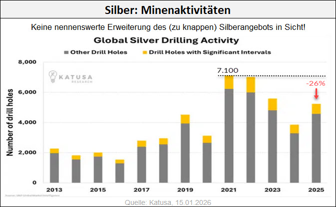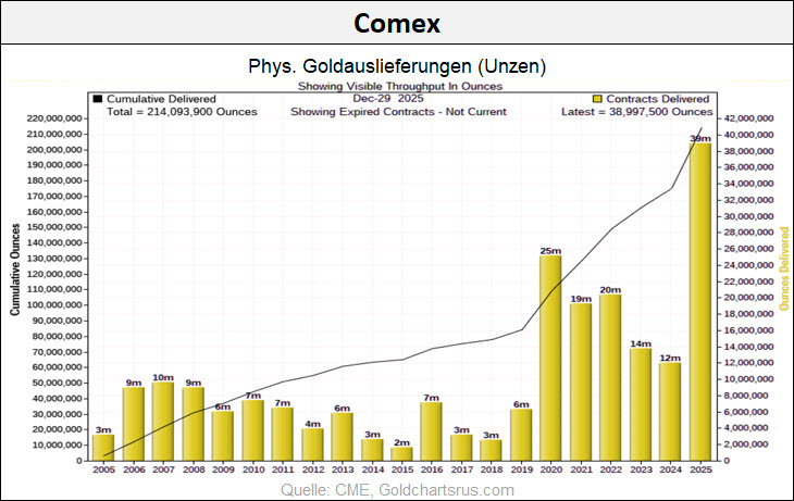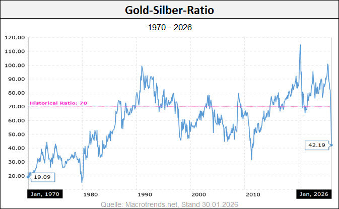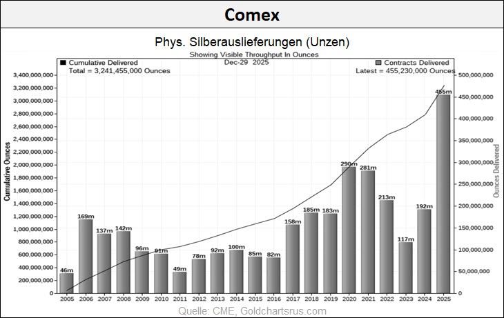 Im Januar blieben die Edelmetallmärkte zunächst im Hausse-Modus, bevor dann an den letzten beiden Handelstagen eine schon crashartige Korrektur einsetzte. Als Treiber der Aufwärtsbewegung sind unverändert die von US-Präsident Trump politisch forcierten Zinssenkungserwartungen bei hartnäckig hohen Teuerungsraten zu nennen, ein sinkendes Vertrauen in den US-Dollar, die unverändert hohe Goldnachfrage seitens vieler Notenbanken oder die eskalierenden geopolitischen Konflikte, wo an vorderster Front ein US-Präsident agiert, der die Welt mit seiner Verwirrspieltaktik jede Woche neu zu schockieren weiß. In diesem Risiko-Umfeld kommen nun auch Investoren an die Edelmetallmärkte, die diese Asset-Klasse bisher nach der Devise „Gold bringt keine Zinsen“ komplett ignoriert hatten. Die mehr als rasanten Kurssprünge sind nach unserer Einschätzung aber auch ein Indikator dafür, dass an den Märkten gerade eine „physischer Short-Squeeze“ – vergleichbar mit einem „Bank Run“ – im Raum steht, der die Edelmetallpreise in ungeahnte Höhen treibt und auch noch deutlich weitertreiben könnte. Fakt ist jedenfalls, dass an den Edelmetall-Terminbörsen – sprich Papiermärkten – seit Jahrzehnten ohne Weiteres auch mal weit mehr als das Hundertfache der tatsächlich eingelagerten Bestände gehandelt wird, was allerdings dann existenzielle Probleme verursacht, sobald die Investoren – wie es aktuell zu vermuten bzw. aus den Statistiken abzulesen ist – im großen Umfang physische Auslieferung verlangen, und die Ware dann außerhalb des US-Dollar-Raums in Sicherheit bringen.
