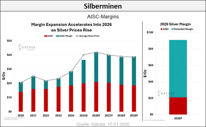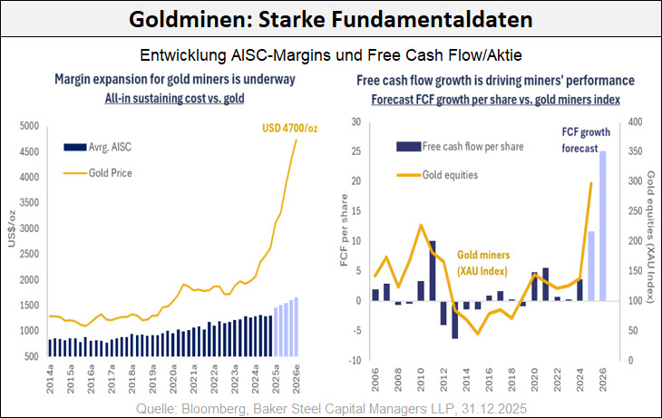 Der Gold- und Silberminensektor konnte in diesem Umfeld mehr als erfreuliche Kurssteigerungen verzeichnen, wobei die fundamentale Bewertung angesichts der sprudelnden Einnahmen und der zurzeit im Vergleich nur verhalten steigenden Kosten (Ölpreis in der Nähe des 3-Jahrestiefs) unverändert als moderat zu bezeichnen sind, insbesondere dann, wenn man von dauerhaft hohen Edelmetallnotierungen ausgeht.