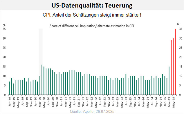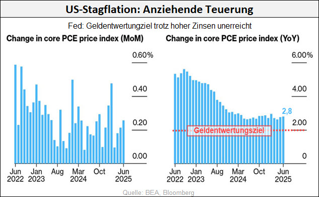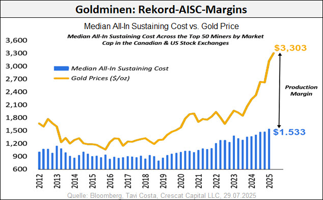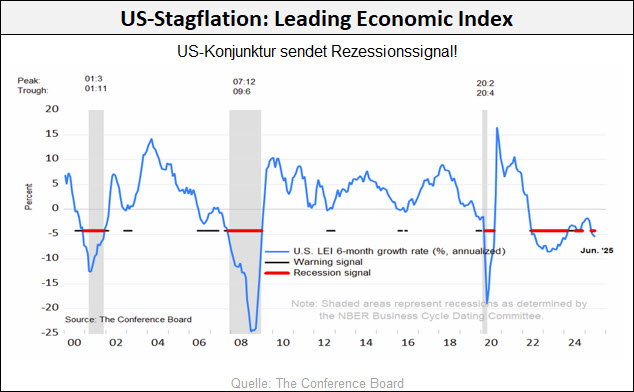 Im Juli setzten sowohl der Goldpreis als auch die Goldminenaktien ihre Konsolidierung fort, während der Silberpreis mit 39,30 USD zwischenzeitlich sogar ein neues Mehrjahreshoch markieren konnte. Vor dem Hintergrund, dass US-Präsident Trump mit der EU und Japan ein Handelsabkommen erzielen konnte, und die Fed im Juli weder die Zinsen gesenkt noch baldige Zinssenkungen in Aussicht gestellt hat, ist die Stabilität der Edelmetallpreise nach den starken Anstiegen beachtlich. Bei den jetzt von den USA mit ihren „Bündnispartnern“ vereinbarten Handelsabkommen kann man allerdings wohl eher von einem Zolldiktat als einer Verhandlungslösung auf Augenhöhe sprechen, schließlich werden die US-Importe aus der EU und Japan nunmehr mit einem 15-%-Zoll belegt, während amerikanische dagegen zollfrei gestellt wurden. Zudem wurden Japan und der EU Direktinvestitionen in den USA in Höhe von 1.150 Mrd. USD „ans Herz gelegt“, erweitert durch eine Verpflichtung der EU, binnen drei Jahren Energieträger (Öl, Ölprodukte, Gas und Kohle) im Wert von 750 Mrd. USD zu kaufen. Wir erwarten nicht, dass sich die BRICS-Staaten – allen voran China – ähnlich einseitige Bedingungen aufzwingen lassen werden, so dass das Handelskrieg-Eskalationspotenzial hier weiterhin nicht unterschätzt werden sollte. Zwar scheinen die USA nun in einer sehr starken Position zu sein, doch trotz aller durch die von den Zollunsicherheiten ausgelösten Vorzieheffekte hat der viel beachtete Leading Economic Index zuletzt ein Rezessionssignal gegeben. Somit gewinnt das von uns erwartete US-Stagflationsszenario immer stärker an Form, zumal auch die neuen Zölle die bereits wieder anziehende US-Teuerung tendenziell weiter nach oben treiben werden. Sollte sich die vom Konsum-auf-Pump getriebene US-Wirtschaft weiter abschwächen und die von Trump beschlossenen Steuersenkungen wirksam werden, muss man abwarten, ob die gigantischen US-Haushaltsdefizite weiter so problemlos zu finanzieren sind.