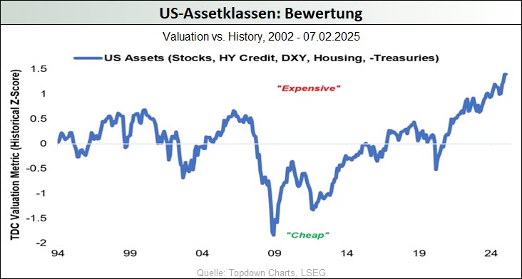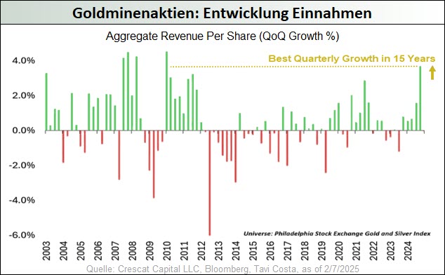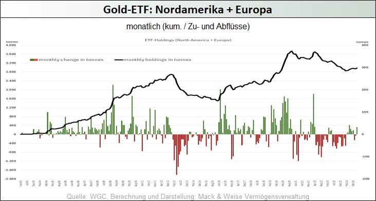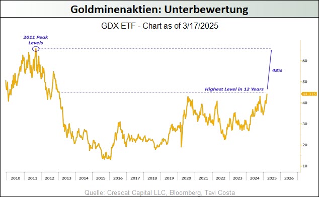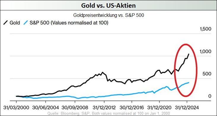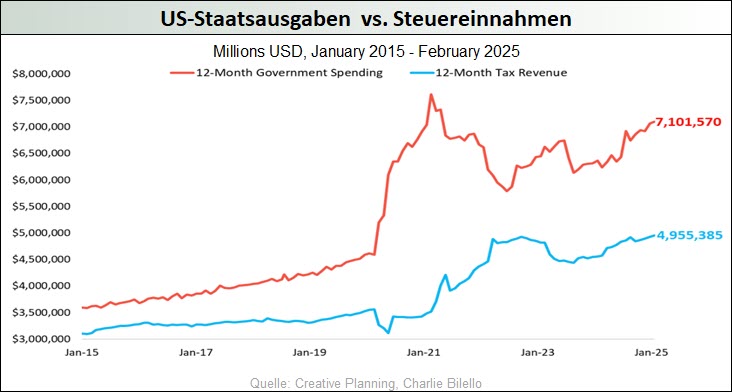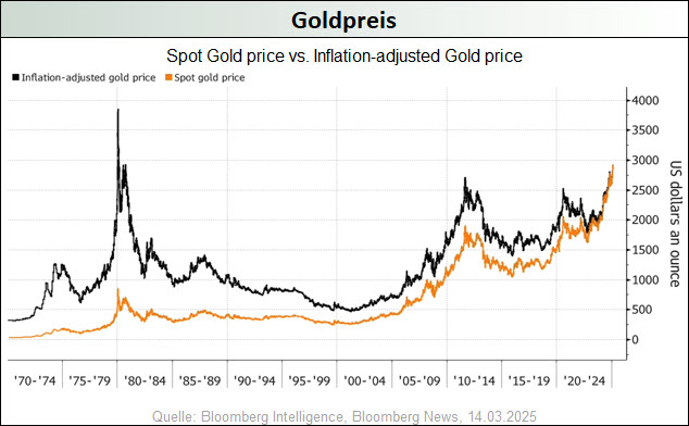 Im Zuge der anhaltenden geopolitischen Spannungen, der hartnäckig hohen Inflationsraten, der Erwartung sinkender Zinsen angesichts wachsender Konjunktursorgen und der schwer einzuschätzenden Handels- und Wirtschaftspolitik der neuen US-Führung konnte der Goldpreis im März erstmals die 3.000-USD-Marke durchbrechen und mit 3.127 USD ein neues Allzeithoch markieren. Auch wenn nunmehr größere Korrekturen an den Goldmärkten nicht auszuschließen sind, könnte das Währungsmetall seinen Aufwärtstrend aber auch durchaus ungebremst fortsetzen, schließlich wird doch diese Bewegung bisher fast ausschließlich – das Interesse breiter Investorenkreise ist kaum spürbar – durch die anhaltenden Notenbank-Goldkäufe dominiert. Das sollte sich ändern, wenn das von uns schon länger skizzierte Stagflationsszenario in den USA in den nächsten Monaten Realität wird. Denn einerseits mehren sich die Anzeichen dafür, dass die rekordhoch verschuldete US-Ökonomie aufgrund der hohen Zinsen und der von Trump erzeugten wirtschaftspolitischen Unsicherheiten nun doch noch in eine Rezession abgleiten wird, während andererseits die unverändert hohen Haushaltsdefizite, die zu erwartenden weiteren geldpolitischen Lockerungsübungen der Fed, die Zollpolitik und die bevorstehende Ausweisung Millionen illegaler, aber billiger Arbeitskräfte dafür sorgen könnten, dass die Teuerungsraten wieder kräftig anziehen.