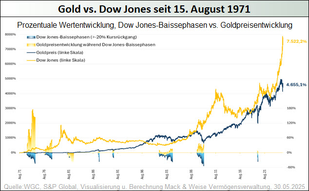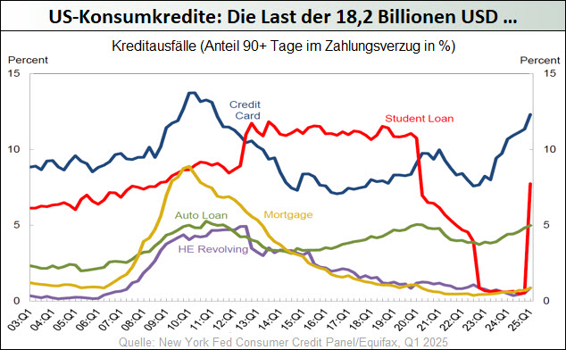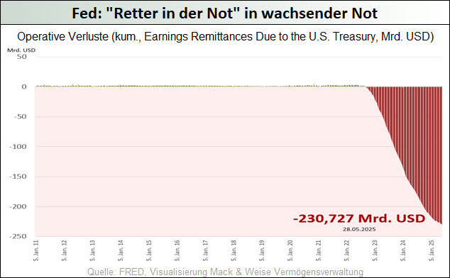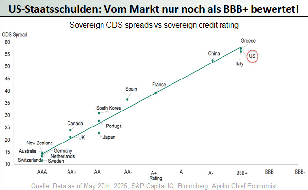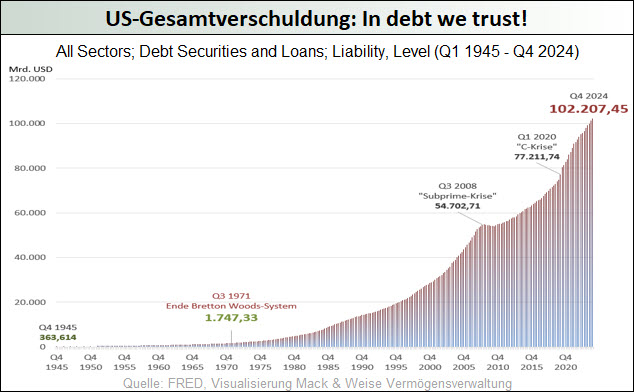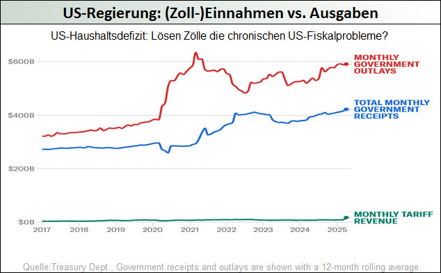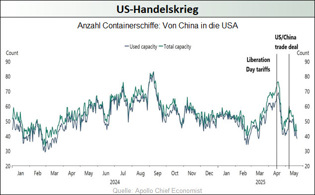 Nachdem der vom US-Präsidenten Trump erklärte Handelskrieg gegen die Welt und insbesondere dessen verbalen Verwirrspiele die Finanzmärkte im April stark verunsichert hatten, hat sich die Lage im Mai angesichts der signalisierten zahlreichen bilateralen Verhandlungslösungen nun deutlich entspannt. Ungeachtet dessen ist jedoch weiterhin davon auszugehen, dass der „Zoll-Dealmaker“ Trump einen notwendigen Politikwechsel von historischer Dimension vollzieht, dem die strategische Überlegung zugrunde liegt, dass die jahrzehntelang verfolgte Zwillingsdefizitpolitik nun an einem Punkt angekommen ist, der die US-Währungsstabilität immer akuter gefährdet (Triffin-Dilemma). Da die sich nun abzeichnenden einschneidenden Zoll-Maßnahmen sowohl das US-Wirtschaftswachstum belasten als auch die Teuerungsraten wieder nach oben treiben werden, scheint nun ein Abdriften der mit 102,2-Billionen-USD verschuldeten Nation in die Stagflation vorgezeichnet.