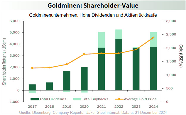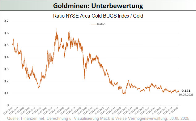 Obwohl der Goldpreis im Mai etwas von seinen Höchstständen zurückkam, so ist dessen Stabilität nach dem vorangegangenen kräftigen Anstieg dennoch mehr als nur bemerkenswert. Da sich zudem auch noch Silber und besonders Platin gut behaupten konnten, könnte dies ein Indiz dafür sein, dass große Investoren schon dazu übergehen, ihre Investitionen mit Blick auf die stagflationären 1970-er-Jahren auszurichten, als Gold und Rohstoffe die beste Performance verzeichneten, während mit Aktien und Anleihen über ein Jahrzehnt lang keine realen Renditen zu erzielen waren. Interessant bleibt in diesem Zusammenhang der Goldminensektor, der trotz kräftig sprudelnder Gewinne, anziehender Dividendenzahlungen und niedriger Bewertungen weiterhin von den Investoren eher vernachlässigt wird. Anscheinend glaubt die große Mehrheit der Investoren nicht an die Nachhaltigkeit der Goldpreisbewegung, was wiederum neben dem immer noch geringen Medieninteresse auch aus antizyklischer Sicht ein starkes Indiz dafür ist, dass wir immer noch erst am Anfang eines insbesondere von der De-Dollarisierung getragenen langfristigen Aufwärtstrends bei Gold stehen. Wir können uns durchaus vorstellen, dass sich die in den 1970-er-Jahren gesehenen Vervielfachungen des Goldpreises in den kommenden Jahren wiederholen könnten.