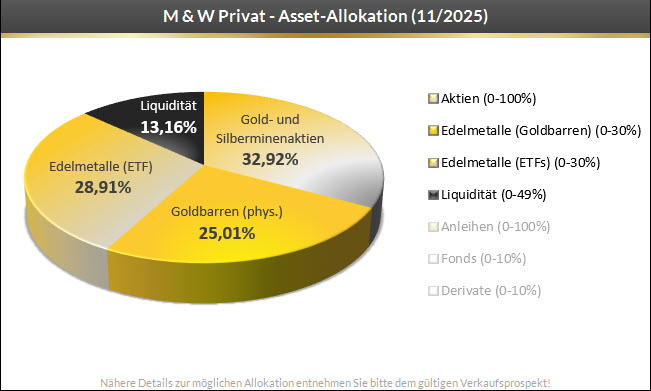 Der M & W Privat investiert strategisch in physisch allokierte Edelmetalle und physisch gedeckte Edelmetall-ETFs. Bei der Diversifikation des Fondsportfolios in Standardwerte des Edelmetallminensektors („Seniors“, Streaming & Royalty-Unternehmen) wird ein vom antizyklischen Market-Timing geprägter Stock-Picking-Ansatz verfolgt. Durch die Flexibilität, bis zu 60 % des Fondsvermögens in physische Edelmetalle allokieren zu können, unterscheidet sich der M & W Privat nicht nur deutlich von allen anderen Edelmetallfonds, sondern auch von allen anderen in Deutschland zugelassenen Multi-Assets-Investmentfonds.